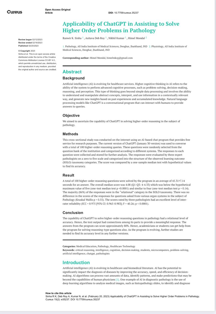 Applicability of ChatGPT in assisting to solve higher order problems in pathology