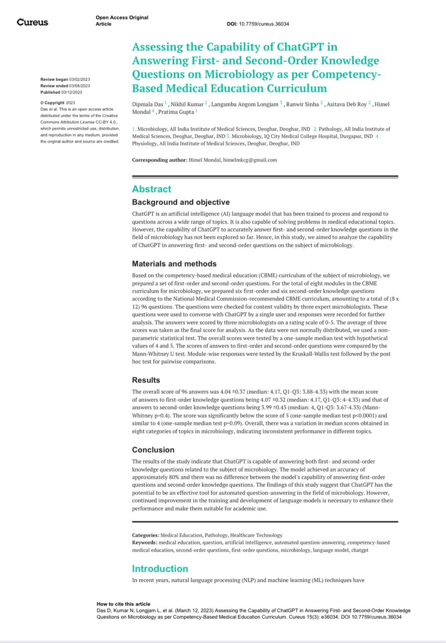 Assessing the capability of ChatGPT in answering first-and second-order knowledge questions on microbiology as per competency-based medical education curriculum